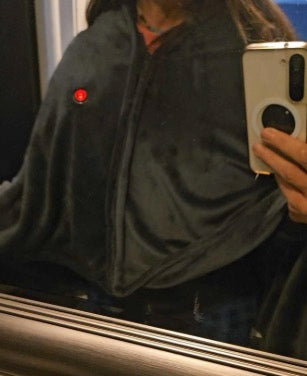 The CozyPod has a one-size-fits-most poncho design with a front zipper and roomy fit. It’s designed to comfortably wrap around your shoulders and torso without slipping off.